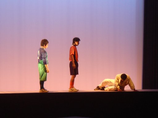 ○おかべあつし(岩手県・40代中頃・男) いろいろな「愛」に満ちた舞台だと感じました。なんか、良いんです。技術的なことを指摘したら、それこそ山ほどあります。でも、ほのぼのと、しみじみと、良いんです。それが第一の感想です。とはいえ、「私ならこうしたい」という技術的なことも二つだけ指摘しておきます。 ・装置へのこだわりをもっと持って欲しいです。舞台前と奥の平台上の二重構造はいいのですが、や はり、この劇の中心となる柔道場はもっと堂々と真ん中にして欲しい。この柔道部の部員数は何人 でしょうか? ワイヤーハンガーは2本情けなく吊されていますが……。何もちゃんとした舞台を 組むというのではありません。作り手のこだわりが舞台から感じられる何かを、観客に提示してほ しいと思います。 ・台詞の量の問題として、どうしても多く語って説明しています。その量の多さに役者の演技も単調 になりがちだと感じました。状況で充分語っている部分もあると思います。 投げられても投げられても向かっていく弱虫HEROの姿に感動しました。もっともっと「汗」を感じる舞台を作ってほしい、と勝手に期待したりもしています。ありがとうございました。 ○黒瀬貴之(広島県・40代・男) シンプルでストレートな物語に感銘を受けました。何よりマサルと大久保先輩の純朴さがイイ。客席で、いつの間にか応援している自分がいました。時々まぶされている笑いが嫌味がなくて、ギャグや言葉遊びに走らず、二人のキャラクターや設定を笑いに生かしているところがよいですね。 いちばんいいのは、やっぱり稽古の場面。ひたすら投げて投げられていたけど、あの投げにウソがないから、劇にもリアリティがあるし、訴えてくるものがある。 ただ、全体を通して、ややセリフによる説明が勝っている印象があります。幸村さんの語りとか、ラスト近く大久保の「アンパンマン」の説明とか。うまく言葉にできないもどかしさとか、モヤモヤがあるんじゃないかな、と思うけど。長い説明のセリフは動きも時間も止めてしまうし……。 とはいえ、そんなことも“投げとばして”くれるような、さわやかで清々しい舞台だったと思います。いい舞台をありがとうございました。 ○市川翔子(愛知県・10代後半・女) この用紙を割り振られるとき、この劇の『弱虫HERO』というタイトルにすごくひかれて、玉名高校さんのこの劇を選びました。男子の多い演劇部さんもめずらしいですよね。お疲れさまでした!! 私は、劇の緞帳が上がる瞬間と下がる瞬間が好きなので、この劇の緞帳が上がった瞬間は、簡素な装置だけの舞台だったので、正直少しガッカリしてしまったのですが、後々「ホリの色が綺麗だなぁ」と思って、それは装置が無駄なくスッキリしているからこそ、ホリの色が素敵に引き立っているのかなぁと思いました。 演技に関しては、あまり感情の起伏が無かったかな、と感じました。どの台詞も同じ間でしゃべっていたのが気になりました。気持ちがたかぶるところは間を無くしてかぶせて言うとか、そういう工夫をしてみるといいんじゃないかなと思います。でも、ちょっとした仕草とかでキャラクターの性格が表現できてました!! 大久保さんが靴ちゃんとそろえてたとことか! 柔道部のお話だったので、練習のシーンとかどうするんだろうと思っていたら、本当に投げていてビックリしました。 これぞ高校演劇!って感じの青春を見せてもらいました。お疲れさまでした! ありがとうございました。 |