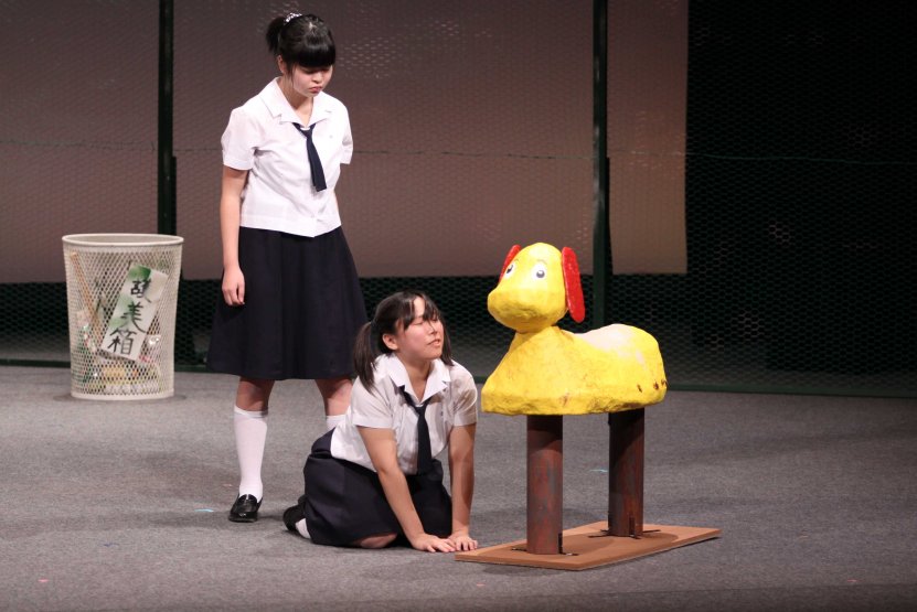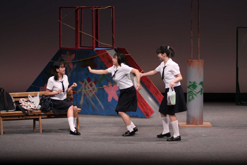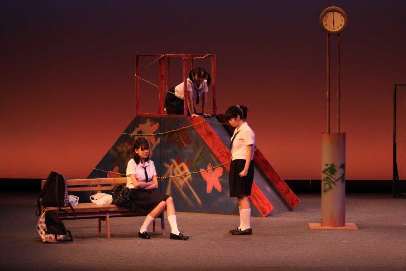 ○黒瀬貴之(広島県・40代・男) 【舞台のスケッチ 真ん中にある時計に「もう少し奥か、上手にあった方がいいかな……」】 素朴で、でもどこか都会的センスも感じさせる、ステキな舞台でしたね。 夕方の公園にやってくる3人のサイトウさんは、それぞれに居場所を見失っている。その居場所は、他人から見れば、たわいないものかもしれない。自分すらきちんと意識していなかったようなものかも。そして、とてももろいもの。失って初めてわかるもの。 3人がじゃれ合うような会話を交わしながら、かろうじて互いを支え合っている姿が、かわいくて切なく、胸に染みました。3人がそれぞれに個性的。特に齋藤綾子さん(たしかに画数多い)の(天然の)存在感! セリフもおもしろくて(「理由はいっぱいあると思いますよ」とか)よかったです。 ラスト、彼女たちの何が変わり、どんな思いで公園を出て行ったのか、がわかりにくかったな、とも思いますが……うーん、それでもいいのかな? とにかく、ステキな舞台でした。 一年生ばかりのクラブ、これからがますます楽しみです。ありがとうございました。 ○おかべあつし(岩手県・40代中盤・男) 文化祭の後夜祭を抜け出した三人のサイトウさんが「ある場所」で出会います。三人は同じ学校、同じ学年ではあるけれど、制服を着ていなければきっと気づかない三人……。共通しているのは、その場所に流れていた音楽の記憶……。 ドラマなんか無くっていい、三人が素敵に存在していました。他愛のない会話のやりとりから三人のキャラクターが立ってきました。 壊れて止まったままの時計は、決まった時間に流れるはずの音楽を流すことなく、そこにある。その時計がまだ動いていた頃、夏の夕暮れ、時計から音楽が流れ出すと、どんなに明るくても子供たちは家へ帰っていった。まだまだ滑り台やブランコで遊んでいたいのに……。 大きなドラマが展開する芝居ではない。三人のサイトウさんがもう聴くことはない、駐車場になってしまう公園に設置された止まったままの時計からの音楽を思い出すとき、彼女たちはまたそれぞれの場所に帰っていく。16歳の文化祭の後夜祭をさぼって出会った小さな思い出とともに……。 間違っているかもしれませんが、私はそんな風に感じました。(オジサンである私の感性なんてそんなもんです‐笑‐) 余談ですが、閉会式後、暗くなって街灯に照らされた倉敷の美観地区を歩きながら、宇中女の芝居を思い出し、ちょっと切なくなったりしました。確かに私は大切な時間を感じることができました。ありがとうございました。 ○グレープフルーツ(岡山県・10代後半・男) 役者がとても上手かったです。自然な演技で笑わせてもらったし、シリアスなシーンには見入りました。セットも、正直すべり台に乗れるとは思ってませんでした。すべり台を使った演出やゴミ占いはとても面白いと思いました。ぼくの中で一番好きなのは、次郎さんでしたけど。 全員一年生というのにも驚きです。部員全員、能力高いなぁと思いました。これからも色々な芝居をしていくと思います。全ての芝居に全力でがんばって下さい。ぼくらも負けないようにがんばります。全国大会、本当にお疲れさまでした。 機会があれば、宇都宮のギョウザを食べたいです。 |